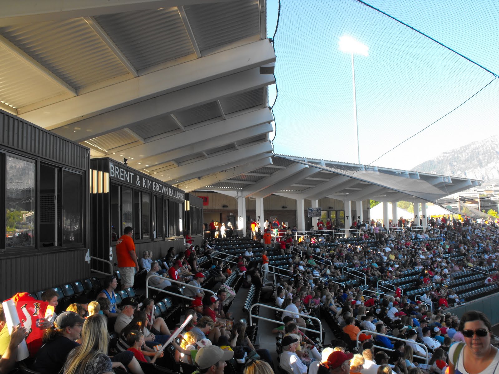 I can say that I did not know what to expect from the stadium after paying for parking on my first visit. As with all the Utah ballparks I have visited so far, Brent Brown Ballpark features a great view of the mountains. The mountains you are viewing is Mount Timpanogos and the Wasatch Range. The most interesting thing about the stadium is the odd dimensions and height of the outfield walls. This makes any routine fly ball an adventure for the outfielders. The grandstand only goes half way down the 1st baseline and extends much further down the third base side. The concourse is on top of the grandstand and features everything that you would expect to see in a concourse. There is a berm that goes all the way down the third base line and goes across to mid center field. This stadium features a ton of foul territory on both sides which can lead to you feeling a little distant from the action depending on where you rest your fanny.